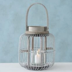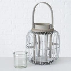 Achieve the Nordic look and hygge cosiness with this beautifully rustic lantern. Crafted from iron with a raw finish, the lantern has a slatted design that allows for maximum candle glow. The glass cup inside holds a pillar candle, while the curved top handle adds homely charm. Display alone or together with the large size.