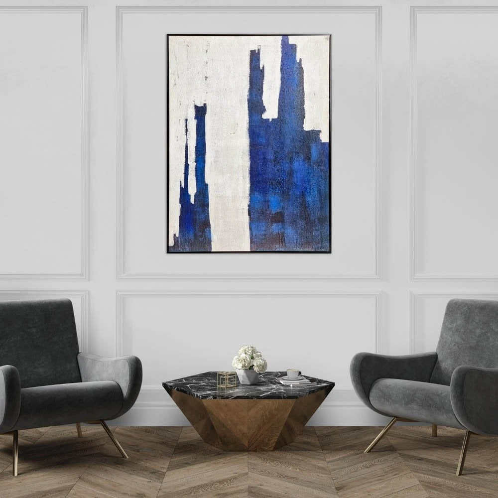 This abstract oil painting will bring your décor up to date. It’s a statement piece of art for contemporary homes and large spaces. Brushstrokes of cobalt blue dominate the neutral backdrop, appearing like buildings rising from city streets. Hand-finished and neatly framed, this is a stylish and striking wall canvas.