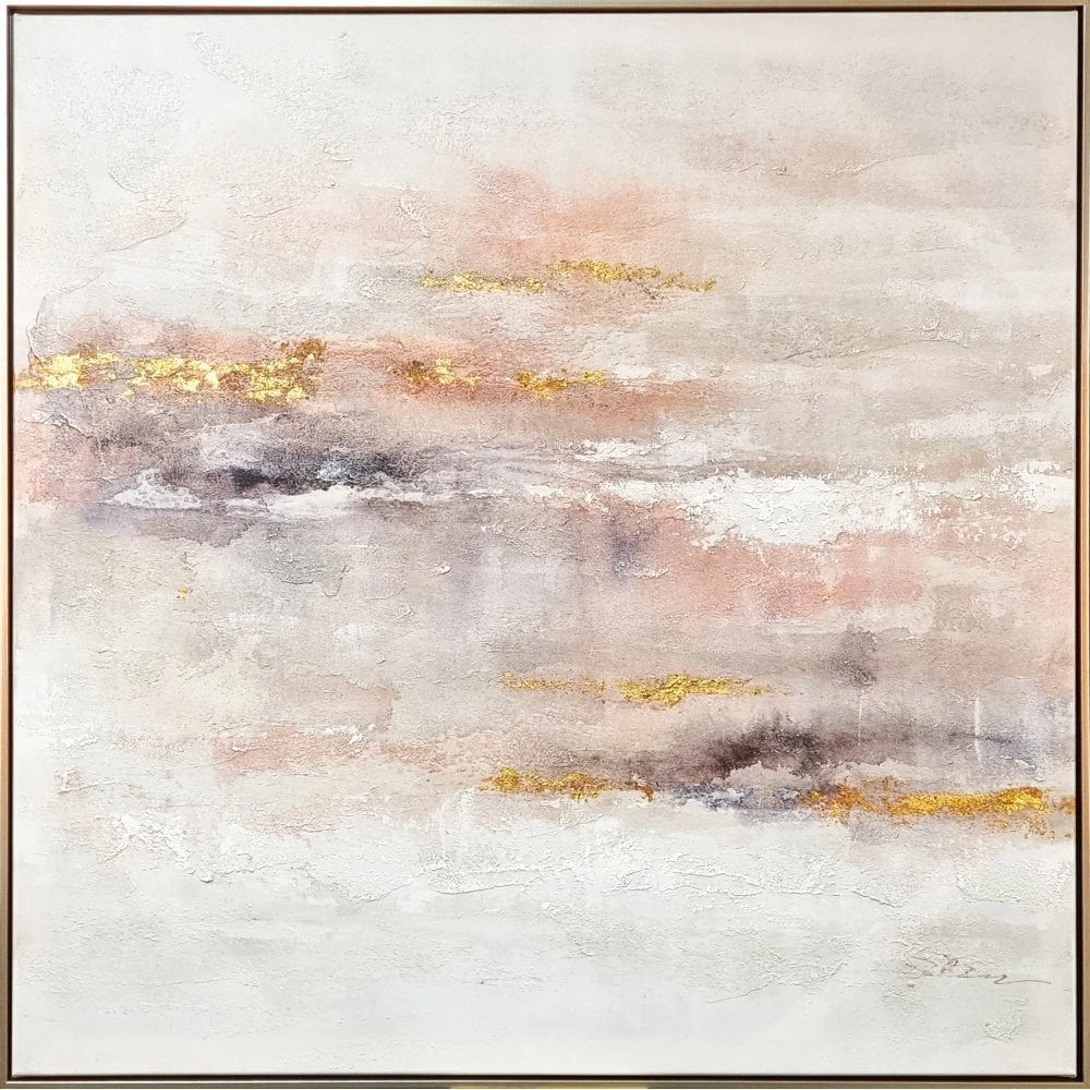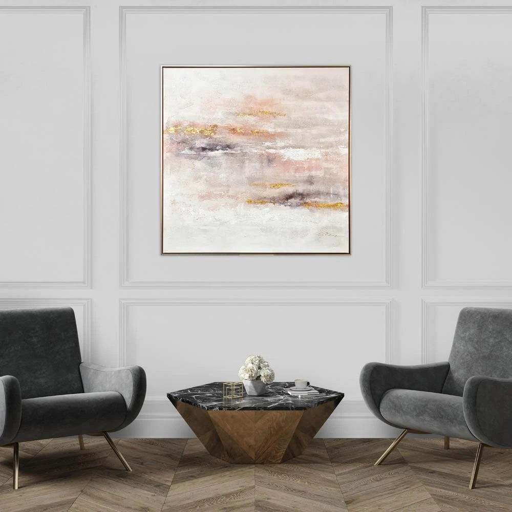 Like the rose-tinged sky of a late summer evening, this abstract oil painting is calming and inspiring. Blush pink and ivory tumble with whispers of grey and touches of deep aubergine. A sprinkling of bright gold adds a luxe look, making this a dreamy work of art for your romantic décor scheme.