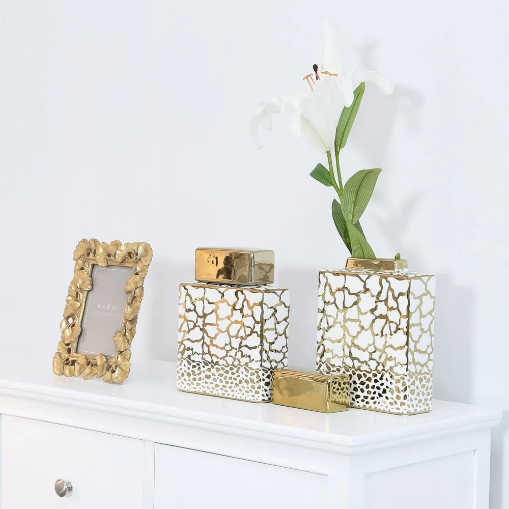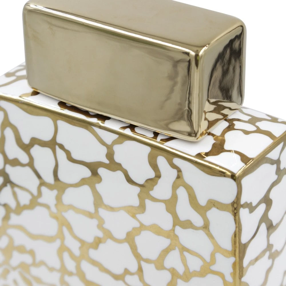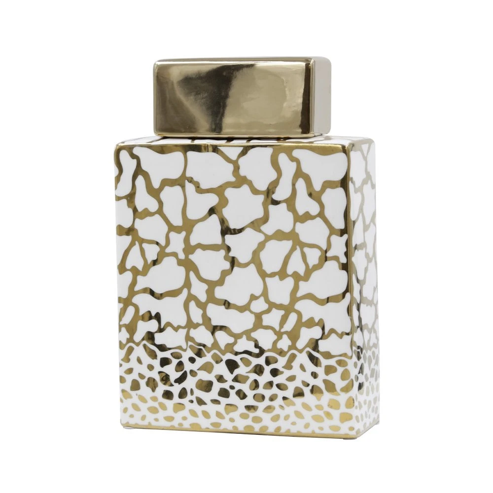 Invite glamour with this modern take on the traditional ginger jar. Crafted in glossy ceramic, the jar showcases a giraffe-spot design in bright gold and white. The boxy shape is a twist on classic curves, while the lustrous gold lid completes the look. Remove the lid to store trinkets or add a faux orchid stem.