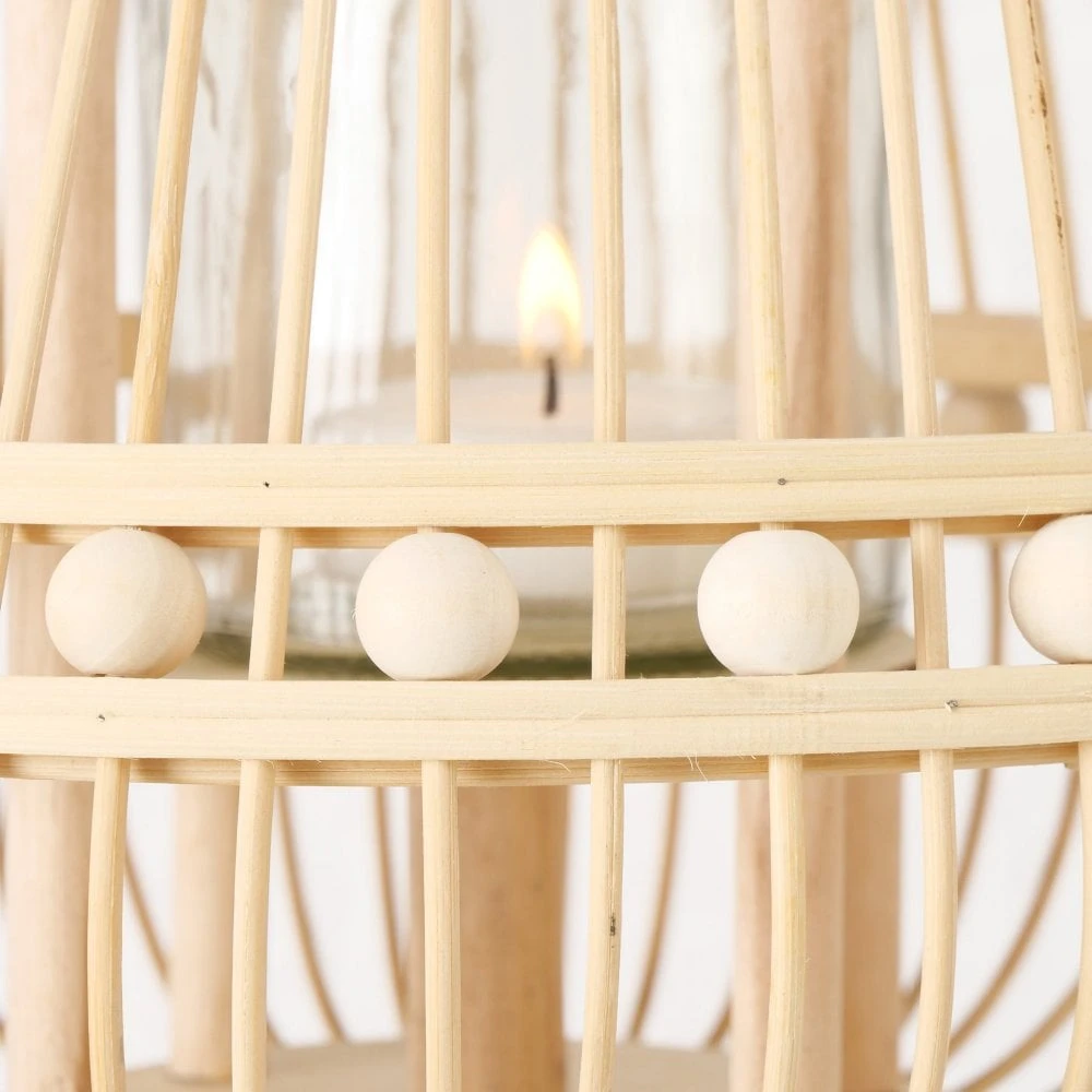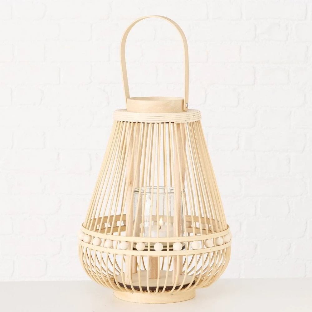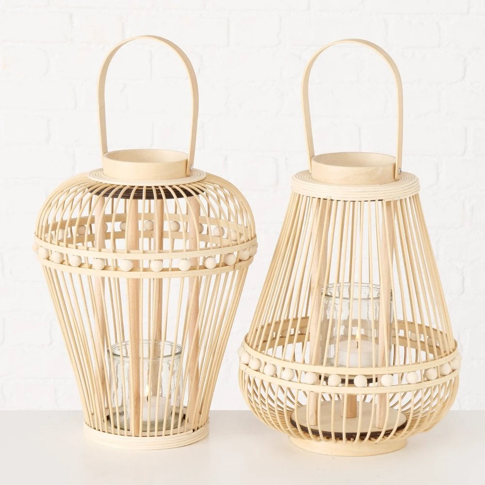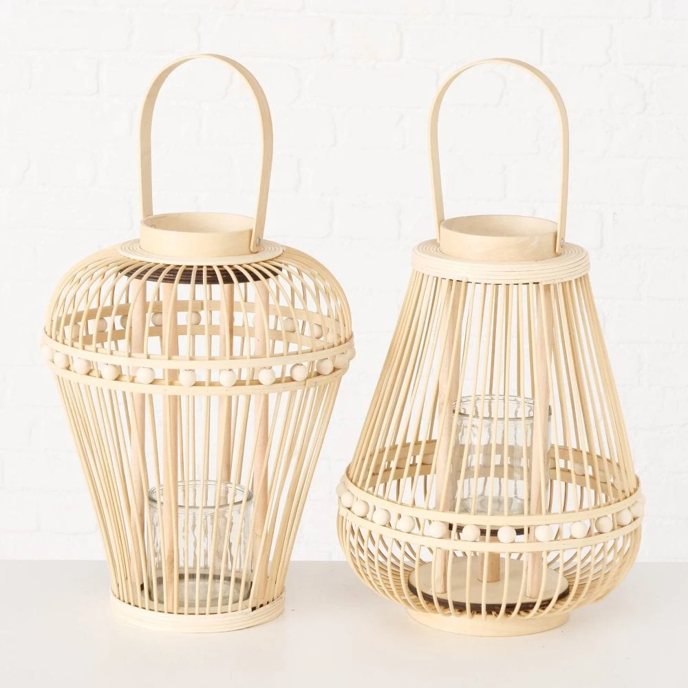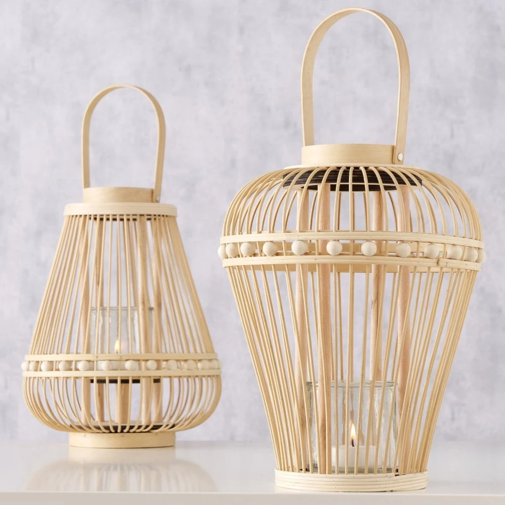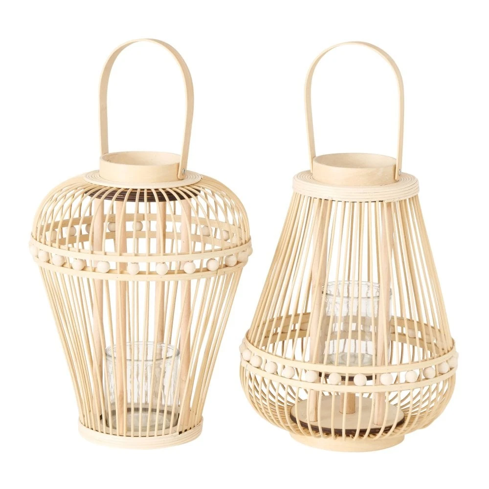 These wicker lanterns are a gorgeous accent for your coastal or rustic space. Presented as a set of two in contrasting shapes, they’re the key to creating a cosy atmosphere. Each bamboo lantern has a curvy, slatted frame with pretty bead detailing and slim top handles. Pop a candle in the glass holders to set the mood.